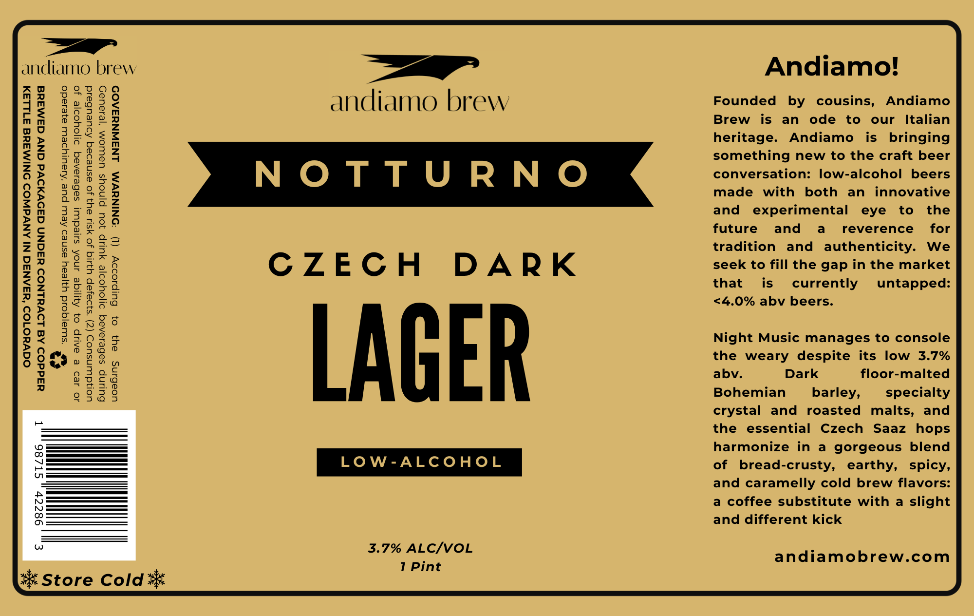 Founded by cousins, Andiamo Brew (an ode to our Italian heritage) is bringing something new to the craft beer conversation: ultra-sessionable beers made with both an innovative and experimental eye to the future and a reverence for tradition and authenticity. We meld cutting edge techniques, European styles rarely encountered in the US, and a visionary imagining of the future to bring delicious, exciting, very low abv (but not NA) beers to consumers looking to be healthier while not compromising on flavor and choice. We seek to fill the gap in the market that is currently untapped: <4.0% abv beers. There is a fertile middle ground between non-alcoholic beers and the "session" beers American breweries make that have higher abv than traditional European brews. We foresee the craft beer consumer continuing to gravitate toward more nuanced, balanced, sophisticated beers with less alcohol.